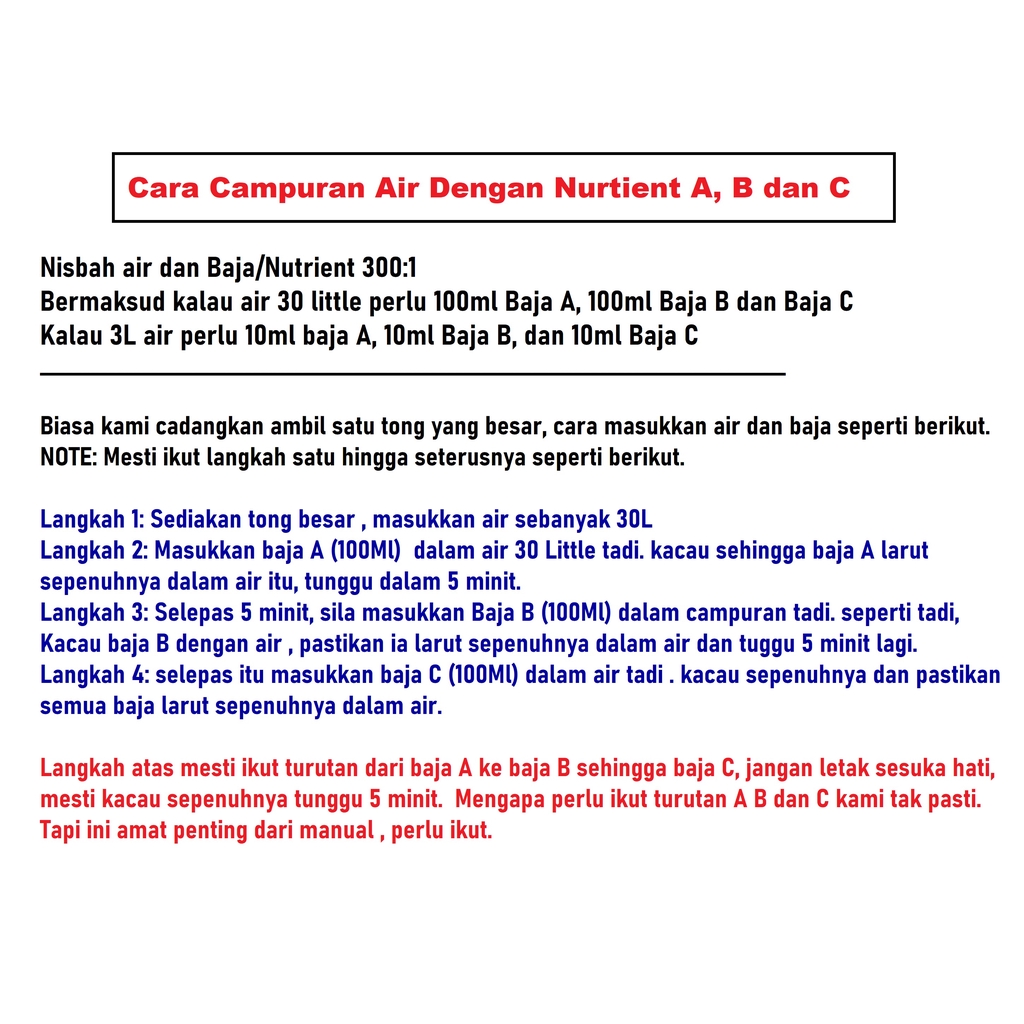 Pertama Anda campurkan larutan nutrisi dengan air sumur. Ada juga penjual yang mencipta sehinga C dan D. Jika nutrisi baja A B sukar didapati di tempat anda atau harganya mahal anda boleh.